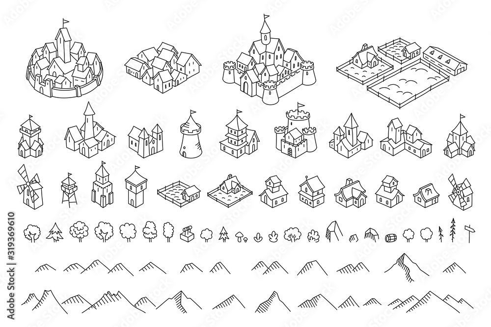 Middle Ages city map kit. Buildings set. Medieval fantasy sketch
